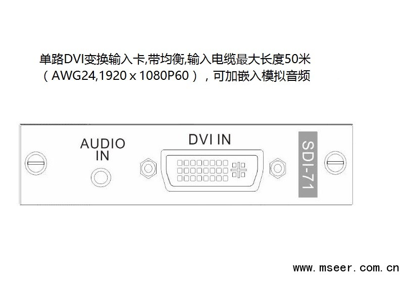 SDI-71 DVI 單通道變換輸入卡,配合SMD主機使用,采用獨立板卡設計,每塊卡支持1路DVI-D輸入,帶均衡,輸入電纜最大長度50米(AWG24,1920ⅹ1080P60),可加嵌入模擬音頻,支持最高1920x1200P60的數字高清圖像傳輸.