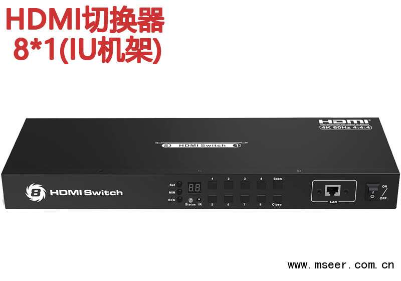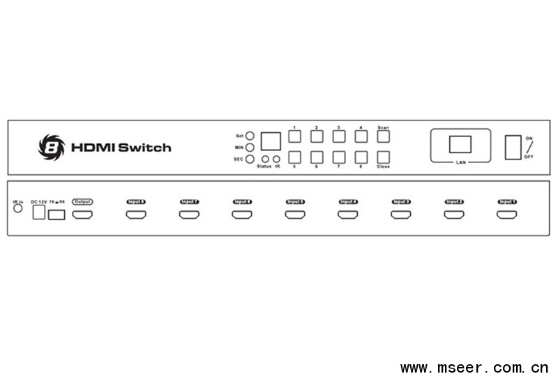 本產品為8x1HDM切換器,通過本產品,你可以任意選擇8個輸入源中的一個輸出到一臺顯示器上。