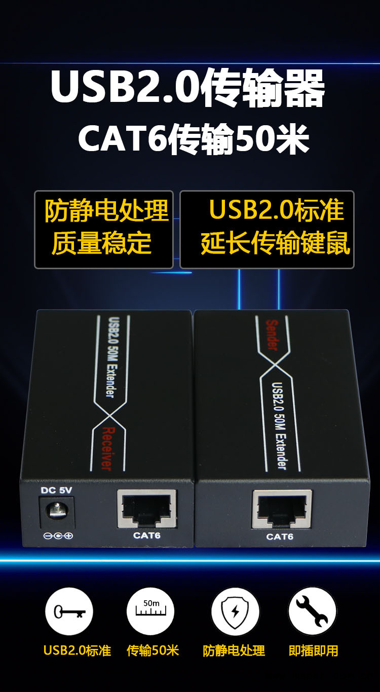 USB2.0延長器包括本地發送端(Transfer)與接收端(Receiver),可以通過單根CAT5/5e/6網線,將電腦的USB信號延長50米。傳輸速率高達480Mbps。該產品廣泛應用于電腦長距離連接打印機、掃描儀、鍵盤、鼠標 和U盤等設備。即插即用,無需驅動和安裝設置。